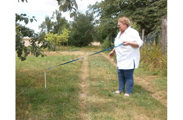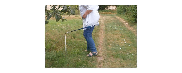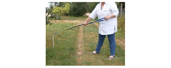 Сделайте шаг к линии, наполовину повернувшись к ней, и возьмитесь за нее свободной рукой. Напряжение должно оставаться неизменным. Теперь возьмитесь обеими руками за поводок перед своим телом.