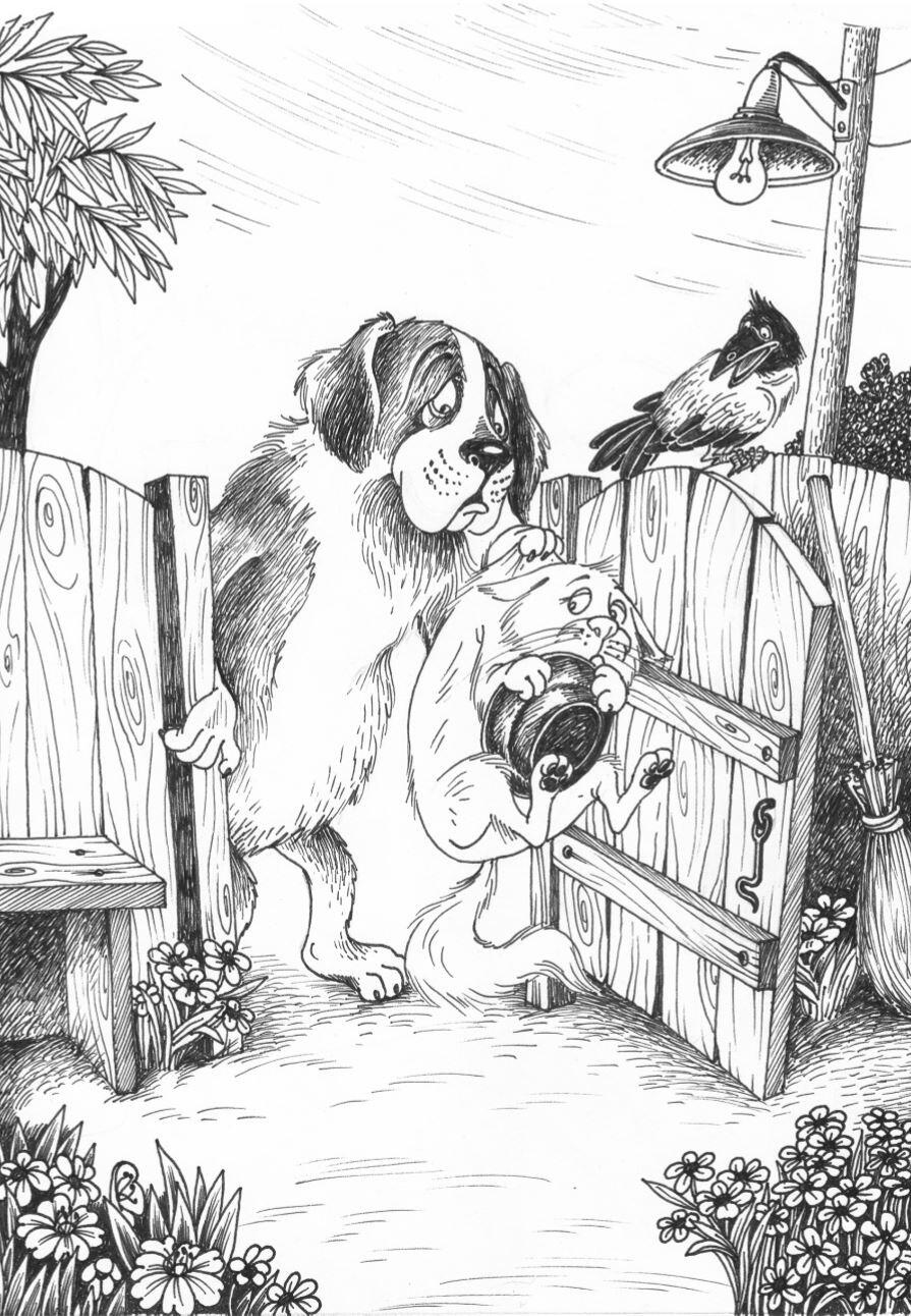 Семён Семёнович и Пёсик Фафик поспешили во двор. Из-за забора раздался громкий стон: «МЯУ!» Затем в калитку вошел сенбернар Ионафан. Он тащил за шиворот кота Базилевса, который прижимал к груди несколько костей и тарелку с голубой каёмкой.