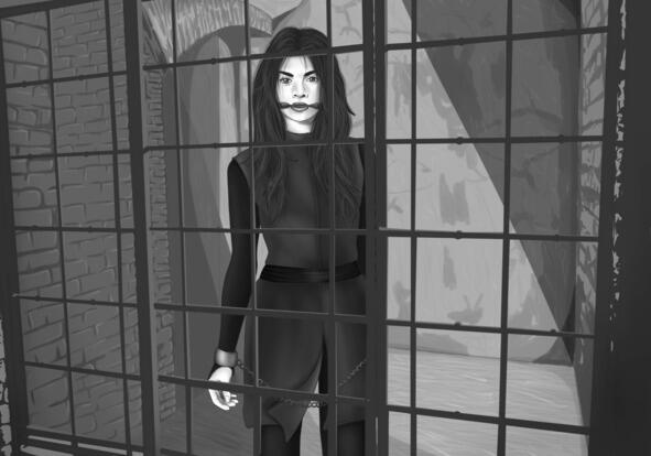 Из-за решетки вывели темноволосую девушку в черном закрытом наряде. Не смотря на оковы и кляп во рту, ее еле могли удержать две женщины. Невольница вырывалась, а на лице ее читалась ярость вперемешку с отчаянием.