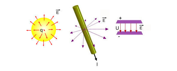 Рис. 1 Электрическое поле вокруг заряженного шара, проводника с током и между обкладками заряженного конденсатора