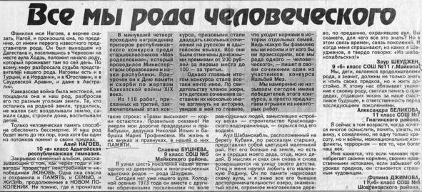 Публикация в газете «Советская Адыгея» с выдержкой из сочинения Славяны Бушневой, занявшей 3-е место, 2001 год