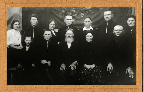 Семья Ледяевых. Нижний ряд слева направо: младший ребенок (имя неизвестно), Александр, Федосей (отец 1870 г.р.), Евдокия (мать 1874 г.р.), Алексей. Верхний ряд слева направо: Катерина, Дмитрий, Мария, Иван, Дарья, Василий, Аграфена (Агриппина, Груша), пр.1940