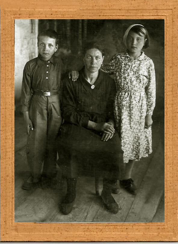 Евдокия Ледяева (Чивкунова) с дочерью Анной и сыном Александром, 1937 год
