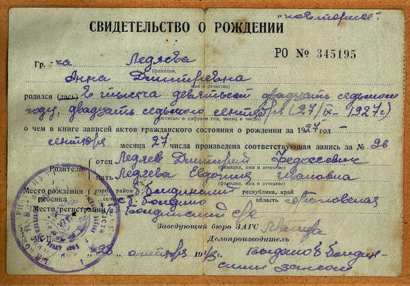 Свидетельство о рождении Ледяевой Анны (дочери Дмитрия Ледяева и Евдокии Ледяевой (Чивкуновой), 27.09.1927 год