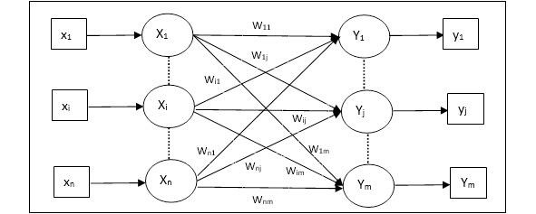 Гетероассоциативная память (Hetero Associative memory) это память, похожа на сеть автоассоциативной памяти, это также однослойная нейронная сеть. Однако в этой сети входной обучающий вектор и выходные целевые векторы не совпадают. Веса определяются таким образом, чтобы сеть хранила набор шаблонов. Гетероассоциативная сеть носит статический характер, следовательно, в ней не будет нелинейных операций и операций с запаздыванием. Архитектура, как показано на следующем рисунке, архитектура сети гетероассоциативной памяти имеет «n» количество входных обучающих векторов и «m» количество выходных целевых векторов.