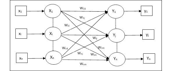 Автоассоциативная память (Auto Associative Memory) это однослойная нейронная сеть, в которой входной обучающий вектор и выходные целевые векторы совпадают. Веса определяются таким образом, чтобы сеть хранила набор шаблонов. Как показано на следующем рисунке, архитектура сети автоассоциативной памяти имеет «n» количество входных обучающих векторов и аналогичное «n» количество выходных целевых векторов.