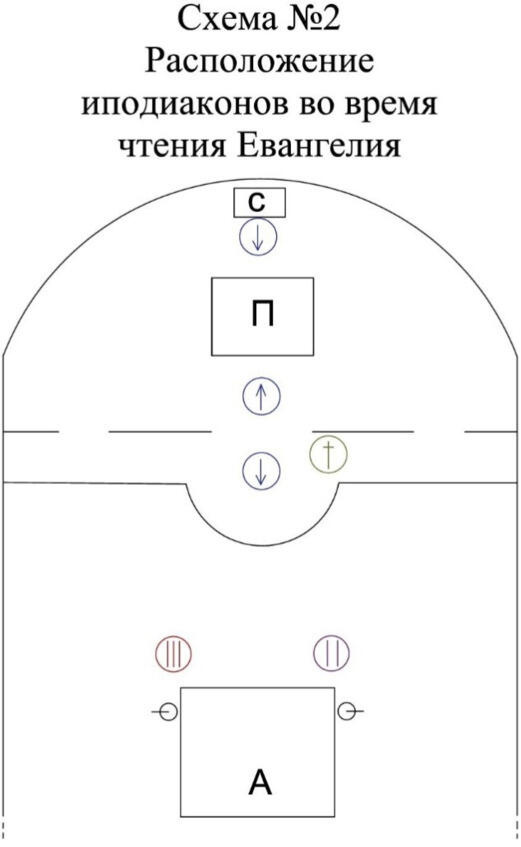 После чтения идет к орлецу на солее, подает иерарху свечи, после чего расходится в противоположные стороны (иподиакон с трикирием в южные, с дикирием в северные врата). У горнего места вместе с рипидчиками крестится, кланяется. Посошник убирает орлец с солеи.