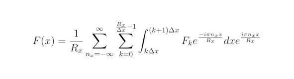 Тригонометрический ряд, который можно получить для произвольной кусочно-дифференцируемой функции F (x,y,z), задаваемой на отрезках (k Δx, (k+1) Δx) для x (0,Rx), (j Δy, (j+1) Δy) для y (0,Ry) и (p Δz, (p+1) Δz) для z (0,Rz), преобразуется к виду: