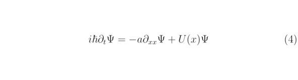здесь a=ħ2/ (2M). Волновая функция ψ выражена семейством функций. Символом Δ обозначают сумму операторов 2/x2+2/y2+2/z2, знак t эквивалентен частной производной /t. Уравнение Шрёдингера, полученное для одномерного случая, возможно преобразовать к виду:
