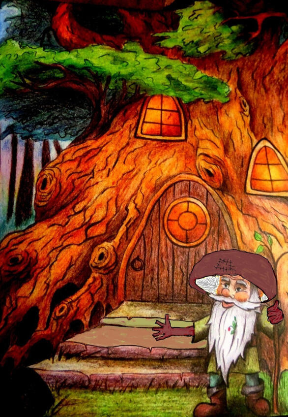 Ручки у него сухонькие, похожие на сучки деревьев, на голове шляпка подберёзовика, вместо носа шишка еловая, а на ногах старые залатанные лапоточки на босу ногу надеты. Встал старичок, и колени у него от старости заскрипели.
