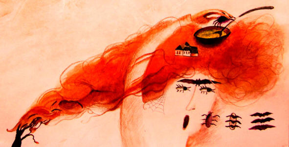 И вот насыплет Колдуша в котёл, что под руку попадётся: старой пыльной паутины, колючек, соли, перца, сухого мышиного помёту, червивых грибов. Иной раз от лени даже и не глянет, что в котёл бросает, и мешает всё это огромной поварёшкой.