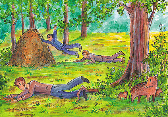 Мальчишки, напуганные близостью кабанихи с детёнышами, побежали дальше, и около их заветного муравейника Коля снова споткнулся и упал. Бежавшие за ним Мишка и Алексей не смогли быстро остановиться, и Мишка ласточкой перелетел через друга и упал прямо на муравейник. Лицо и вся голова оказались облеплены муравьями, даже несколько штук вместе с мелкими ветками попали в рот. Он вскочил, выплюнул насекомых с мусором изо рта и, стряхивая с себя муравьёв, которые уже заползли под одежду, побежал за ребятами.