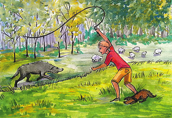 Приглядевшись, понял, что это волк. Зверь, не обращая внимания на Михаила, направился к пасущимся недалеко овцам с ягнятами, намереваясь, по всей видимости, схватить ягнёнка. Михаил, недолго думая, щёлкнул кнутом изо всей силы. Звук получился громким, похожим на выстрел. От неожиданности волк остановился и даже пригнулся к земле. Пока зверь определял, откуда может исходить опасность, Михаил приблизился на расстояние длины своего кнута и стеганул по волку так, что на шкуре мгновенно проступил красный рубец. Волк взвизгнул и, поджав хвост, бросился бежать к лесу, едва увернувшись от удара кнута папы, и скрылся в чаще.