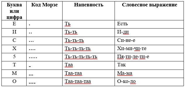 Для того чтобы отличить радиопередатчики друг от друга и от других радиостанций, каждый радиопередатчик имеет свой позывной. Позывные передаются с использованием азбуки Морзе. В спортивной радиопеленгации используется далеко не вся азбука (таблица 1). Не следует запоминать «морзянку» в виде количества точек и тире. При высокой скорости передачи сосчитать количество посылок будет невозможно. Следует запоминать ритмический рисунок, напев каждого знака. Для облегчения запоминания придумана таблица словесного выражения кода Морзе, в которой каждой букве соответствует слово с похожим ритмическим рисунком.