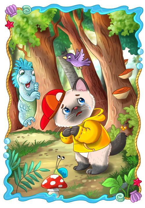 Дождавшись благоприятного момента, котёнок незаметно выскочил за дверь. Он считал себя взрослым и самостоятельным и направился прямиком в лес. Любуясь цветочками, догоняя бабочек, малыш уходил всё дальше и дальше, пока не понял, что заблудился. Котёнок хотел заплакать, но, вспомнив, что он взрослый, сдержался. А поразмыслив, как теперь быть, решил позвать на помощь.