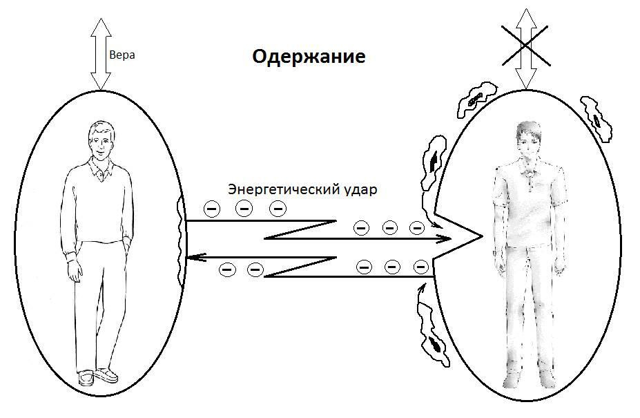 После смерти физического тела, сознание личности продолжает существовать в тонкоматериальном теле (что и называют в народе душой), но, не имея устремлённости вверх к своему Духовному Началу, застревает в низших мирах астрального мира (Кама Локе). То, к чему стремилась личность, ещё при жизни, и губит её. По закону магнита или взаимного влечения, сознание личности притягивается туда, куда стремилось. Застрявшие, развоплощённые сущности «сгорают от собственных страстей» это и есть библейский сгорают от собственных страстей, ибо, лишившись физического тела, через которое они могли удовлетворять свои страсти (пить, курить, употреблять наркотики и прочее), они мучаются. В конце концов, их ждёт полное разложение. Но, чтобы выжить в Кама Локе, они питаются разложением других существ и тянутся к тем, кто ведёт подобную им физическую жизнь. Они, не имея физического тела, не могут удовлетворять свои страсти и поэтому тянутся на физический план к людям. Присосавшись к ауре алкоголика или наркомана, они питаются флюидами алкогольных и наркотических веществ, излучаемых человеческим телом. При употреблении горячительных напитков происходит огромный выброс энергии, что и нужно этим сущностям (в народе называют их лярвами). Пока они находятся на внешней стороне ауры, их роль маленькая «шептать», «подкидывать вредные идеи», подталкивать человека к нужным им поступкам. Но, когда чья-то «огромная стрела» (злой, разрушительной человеческой воли) пронзила ауру человека, и образовался пробой в заградительной сети, а это возможно, если нет подпитки с Высших миров, то эти сущности тонкого мира устремляются вовнутрь и завладевают физическим телом человека, как своим. И таких одержателей может быть множество. При этом сознание или душа человека вытесняется из физического тела, но не полностью, чтобы не убить человека сразу (как грифель в карандаше можно вытолкать другим грифелем наполовину). Завладев физическим телом, они становятся полновластными хозяевами и делают с этим телом всё, что им нужно это и есть сгорают от собственных страстей. Для образного представления предлагаю рассмотреть рисунок 6