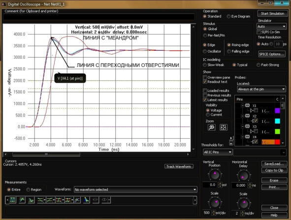 Можно отметить хорошую сходимость результата анализа 427 МГц, полученного расчетным путем, и результата 430 МГц, полученного в среде моделирования/анализа HyperLynx.