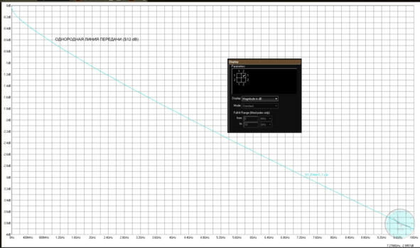 Из рисунка видно, что однородная прямая микрополосковая линия передачи является апериодическим звеном первого порядка, АЧХ которой имеет практически линейный спад с частоты среза примерно 7,4 ГГц по уровню -3дБ.