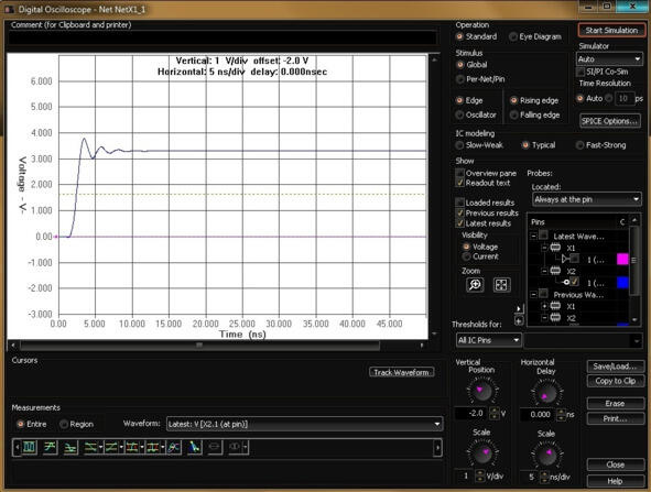 Ранее аналитическим путем было рассчитано ее значение, равное 430 МГц. Проверим правильность вычислений в среде HyperLynx с использованием IBIS модели LVCMOS33_S_12.IBS с максимальным выходным током 12 мА.