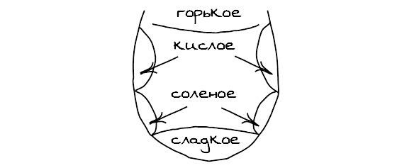 Немного отвлечемся. На рис. 2 представлена картинка времен школьный биологии: язык, поделенный на сегменты. И каждая часть языка наиболее чувствительна к тому или иному вкусу (на самом деле рецепторы ко всем вкусам есть на всех участках, но в некоторых зонах они сконцентрированы в наибольшем количестве). Всего 4 вкуса: сладкий, соленый, горький, кислый.