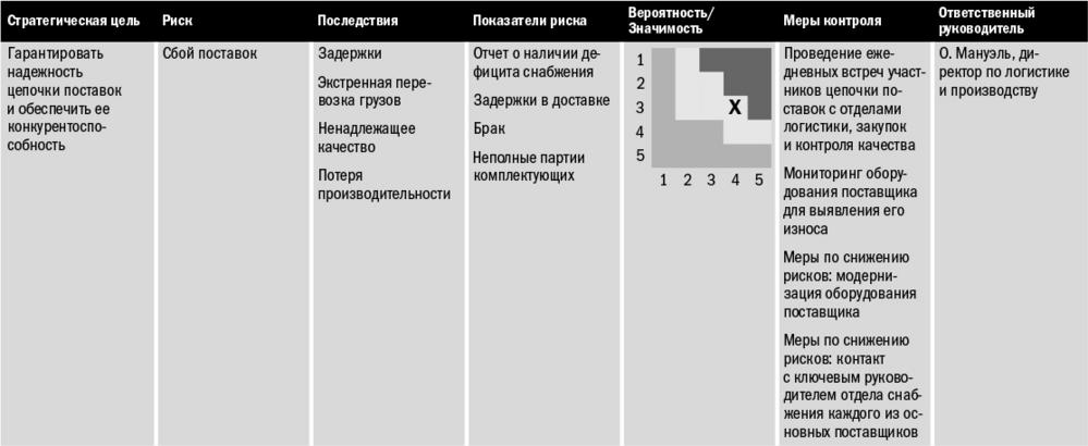 VW do Brasil использует карточки событий, чтобы оценить стратегические риски. Прежде всего менеджеры выявляют угрозы, которые могут помешать компании достигнуть каждую из ее стратегических целей. Затем для каждого выявленного риска менеджеры создают карточку, в которой перечисляют практические последствия события для операционной деятельности. Ниже приведен пример карточки, в которой рассматриваются последствия проблем с поставкой, угрожающие стратегической цели VW по обеспечению бесперебойно функционирующей цепочки поставок.