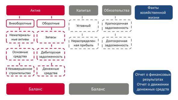 В бухгалтерском балансе активы находят отражение в одноименной части баланса, обязательства в пассиве, а факты хозяйственной жизни в отчете о финансовых результатах и в отчете о движении денежных средств.