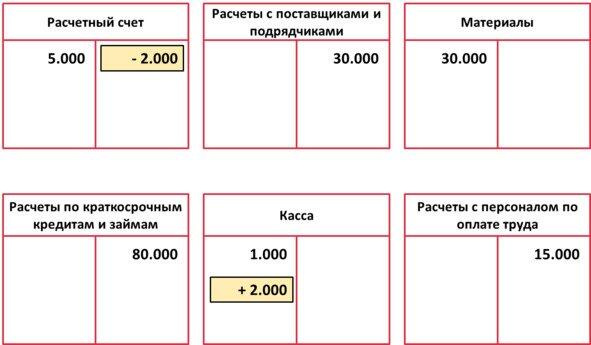 Оба счета активные, поэтому по счету «Касса» по дебету будет увеличение на 2 000, а по «Расчетному счету» по кредиту уменьшение также на 2 000.