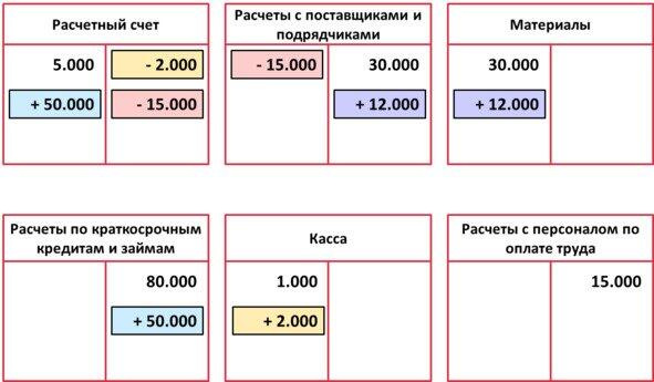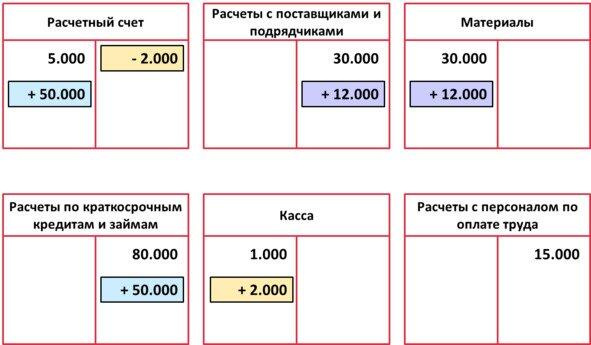 «Расчетный счет» активный, поэтому поступление денег отражается по дебету счета. Счет «Расчеты по краткосрочным кредитам и займам» является пассивным, поэтому увеличение задолженности перед банком на сумму 50 000 будет отражаться по кредиту счета.