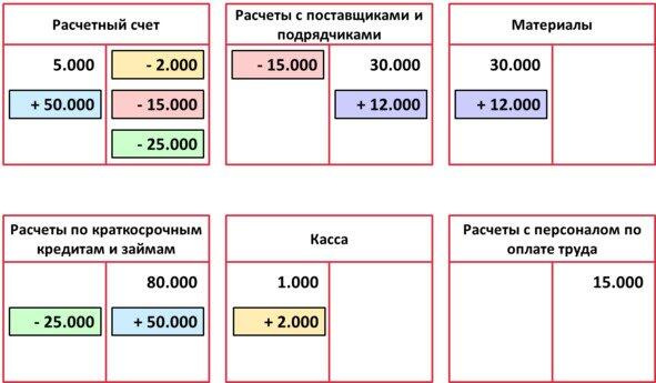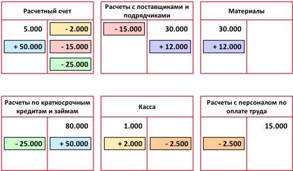 Проведем шесть хозяйственных операций и отразим их в бухгалтерских счетах, используя принцип двойной записи.