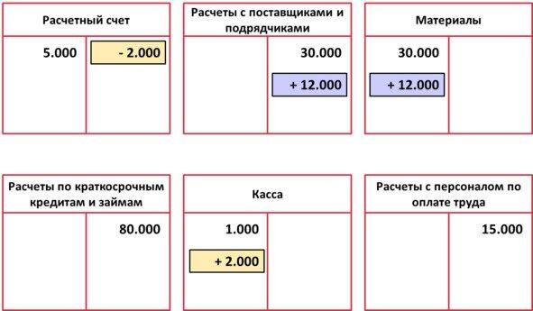Данные операции будут отражаться на счетах «Расчеты с поставщиками» и «Материалы». Так как счет «Материалы» активный, поступление будет отражаться по дебету. Однако теперь у организации появилась задолженность перед поставщиками на сумму 12 000. Счет «Расчеты с поставщиками» активно-пассивный, увеличение задолженности отражается по кредиту.