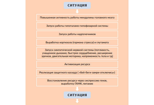 На ней изображены последовательные этапы запуска «работы» стресса на уровне мозга, нейронов и тела в целом.