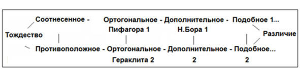 Так по мере перехода от познания одинаковости вещей, их количеств и свойств (тождественности) к постижению все более далекого их родства, ребенок поднимается к освоению все более сложных школьных знаний, к познанию более полных теоретических моделей, отражающих гармонию и единство мира. Причем верхний ряд Схемы 3 через понятие «соотнесенное» дает возможность просчитывать реальность. Тогда как нижний ряд, через понятие «противоположное», позволяет правильно ее понимать, причем не иначе как разнообразие физических, биологических и социальных процессов.