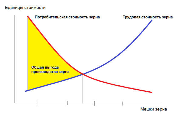 Теперь допустим, что, помимо зерна, у Робинзона появилась возможность выращивать виноград. Каким образом он распределит свои трудовые усилия, как он определит, сколько зерна и винограда ему выгодно выращивать? Понятно, что он будет сопоставлять выгоду, полученную от производства зерна, с выгодой, которую он сможет получить от производства винограда. И станет выращивать зерно и виноград в таких количествах, чтобы общая полезность от хлеба и вина максимально превышала усилия, затраченные на их выращивание. И эта выгода, заметим, также будет зависеть от трудовой стоимости зерна и винограда, а не от одной только их потребительской стоимости.