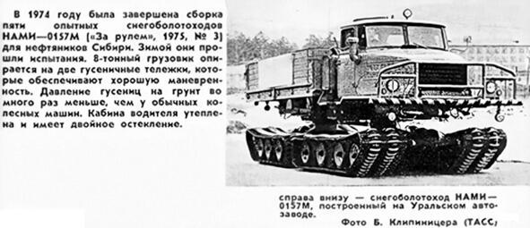 Статья в журнале «За рулем» 7 за 1976 год, посвященная снегоболотоходам НАМИ-0157М. На фото машина с ДВО Deutz F8L413FW