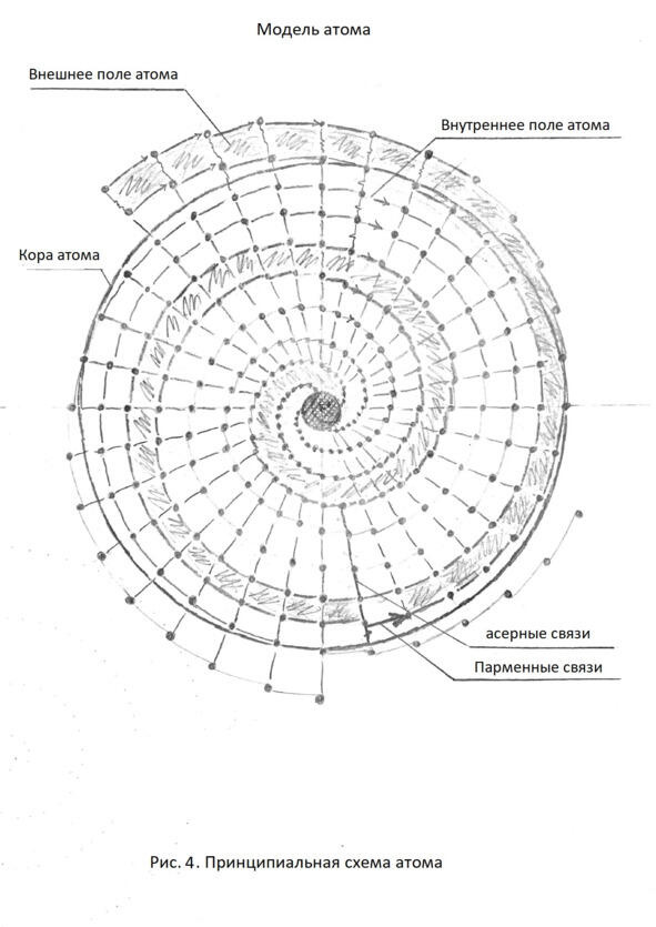 Вопрос, из чего состоит космическая туманность? Если она состоит из газов то, силы тяготения превратят газ в жидкость. Атомно-молекулярная теория вещества гласит, что между атомами действуют притяжение и отталкивание. Между атомами существуют пустоты, авторы учебников физики умалчивают, что пустоты поля атомов, создающие притяжение и отталкивание. Все явления должны иметь причину: притяжение и отталкивание создается взаимодействием полей атомов. Существует вопрос, что такое поле? Для демонстрации полей ниже я предлагаю наглядную модель атома, где частицы образуют гравитационную сеть. Связанные друг с другом частицы движутся по спирали на центр атома (рис. 4).