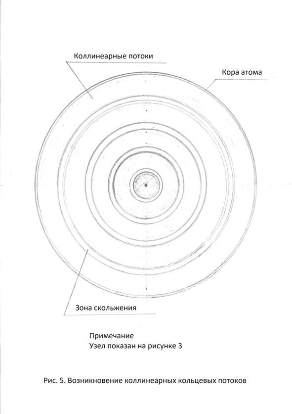 Между кольцами возникают зоны скольжения, а в целом такой атом сможет существовать (рис. 5). При взаимном смещении смежных колец происходит разрыв асерных связей и трение, на это затрачивается энергия. Если углубиться в тему, энергия не теряется, так как действует закон сохранения энергии. Энергия, затраченная на разрыв асерных связей, создает в зоне скольжения вторичное вихревое движение СА (свободных амионов). Как это происходит?