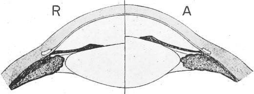 R предполагаемое состояние покоя хрусталика, при котором он настроен на зрение вдаль. На А, согласно предположениям, поддерживающая мышца расслабляется через сокращение цилиарной мышцы, позволяя хрусталику выпячиваться вперед ввиду его эластичности.