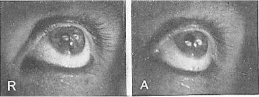 R, состояние покоя; А, аккомодация. Под увеличительным стеклом никакого изменения размера двух изображений не наблюдается. Изображение справа выглядит больше только потому, что оно более четкое. Для поддержания теории Гельмгольца оно должно быть меньше. Хвостик кометы на рисунке слева это случайное отражение от роговицы. Отблеск света внизу просто отражение вспышки фотокамеры, на которую был запечатлен глаз. Потребовалось два года, для того чтобы получить эти фотографии.