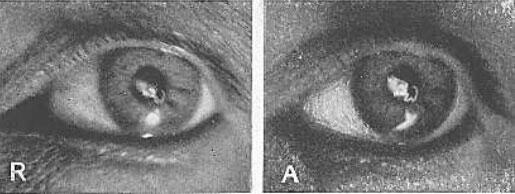 R, состояние покоя; А, аккомодация. Размеры изображений на обеих картинках одинаковые. Изображение на роговице настолько мало́, что оно не претерпело заметных изменений при несильном изменении, которое имело место в роговице во время аккомодации. На рисунке А оба изображения изменили свое расположение, а замыкающая часть отражения от хрусталика была отрезана радужкой, но она остается той же самой. Белый блик между двумя изображениями нити накала есть отражение от лампы, использовавшейся для освещения глаза. Заметьте, что на рисунке А видна бо́льшая часть склеры, что указывает на удлинение глазного яблока во время аккомодации.