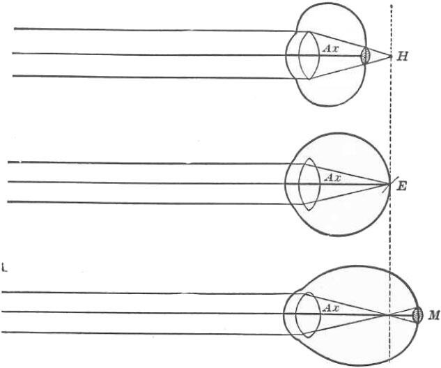 Н, гиперметропия; Е, эмметропия; М, миопия; Ах, оптическая ось. Заметьте, что при гиперметропии и миопии лучи, вместо того чтобы идти к фокусу, формируют круглое пятно на сетчатке.
