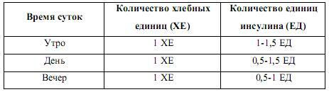 В таблице ниже представлены средние значения потребности в инсулине на количество хлебных единиц, в зависимости от времени суток. Значения в таблице даны для молодых людей среднего телосложения без сопутствующих заболеваний.