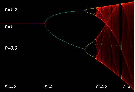 Компьютерный эксперимент показывает, что для значений чуть больше 2 популяция попадает в 2-цикл, её численность бесконечно прыгает взад и вперед между значением выше 1 и значением ниже 1. По мере дальнейшего увеличения