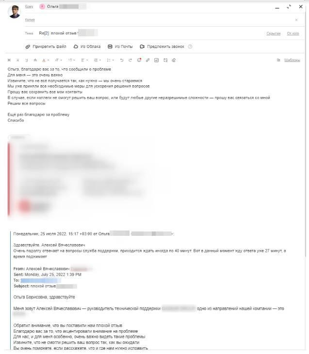 Ниже пример переписки руководителя с Нашим клиентом.Ну и в заключение этой главы, очень важно не называть клиентов проблемными клиентами, сложными клиентами, а возможно и другими нелицеприятными эпитетами. У нас это Наши клиенты. Ещё раньше мы называли таких клиентов Любимыми клиентами. Позже мы отказались от словосочетания «Любимый клиент» это звучит как-то вычурно, с издёвкой что ли, с каким-то пафосом, сарказмом. Мы отказались от формулировки «Любимые клиенты» в пользу «Наши клиенты».