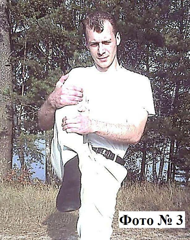 5). Очень важно, по крайней мере, очень желательно развивать у себя умение сохранять равновесие. Делается это достаточно простым способом. Поднимите согнутую в колене ногу и прижмите её обеими руками к своей груди Фото 3, после чего простойте в таком положении секунд 20-30. А затем, не вставая на поднятую ногу, прижмите её рукой сзади и простойте так ещё 20-30 секунд (то же самое проделайте и со второй своей ногой).