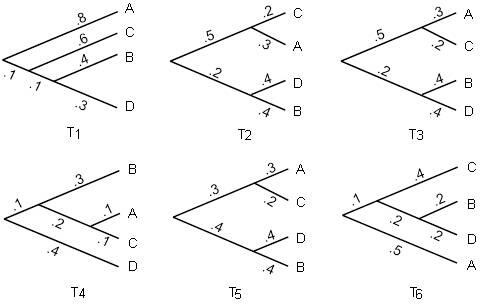 б. Нарисуйте все 15 топологически различных корневых раздвоенных деревьев, которые могли бы описать связь между 4 таксонами.