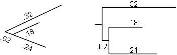Метрические деревья иногда рисуются в «квадратном» стиле, чтобы было легче сравнивать расстояния по различным эволюционным путям. Например, два дерева на рисунке 5.4 представляют одну и ту же информацию. В дереве слева ребра имеют указанную длину, а в дереве справа горизонтальные ребра имеют те же длины. Таким образом, вертикальные ребра на правом дереве считываются как не вносящие никакого вклада в количество мутаций; они служат исключительно для разделения различных линий для повышения читабельности.