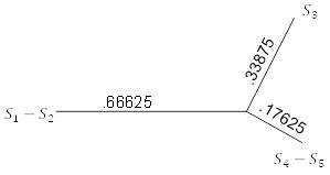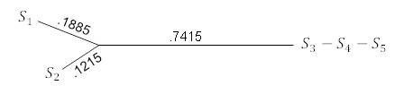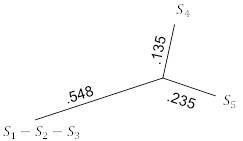 Имея только три таксона в этой таблице, можем точно подогнать данные к дереву, используя 3-точечные формулы, чтобы получить рисунок 5.10. Ключевым моментом здесь является то, что 3-точечные формулы, в отличие от UPGMA, могут давать неравные расстояния таксонов от общего предка.