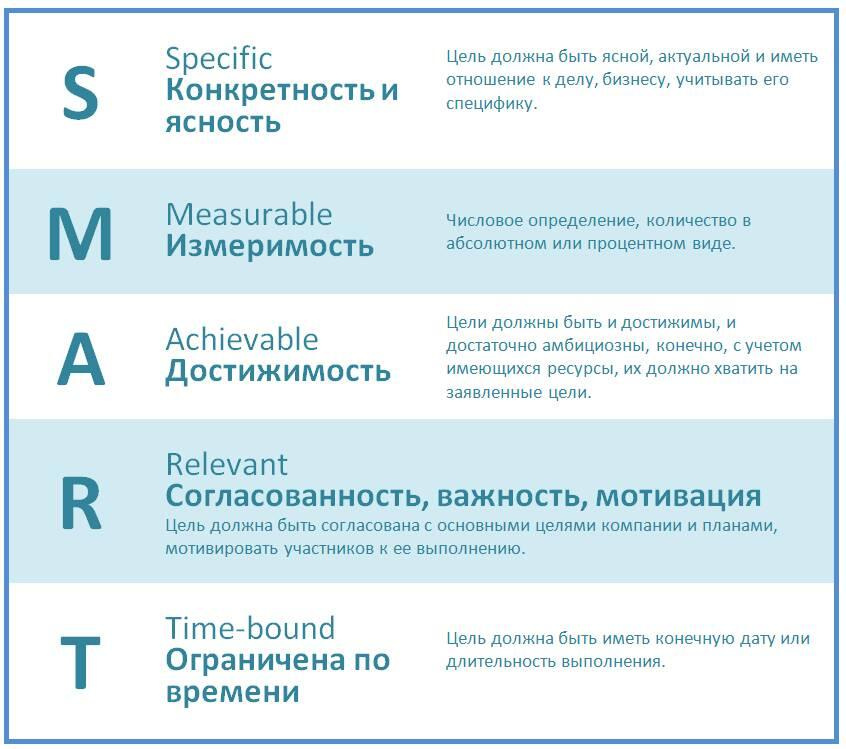 Цели по системе SMART должны быть конкретными и ясными иметь отношение к делу и учитывать его специфику.