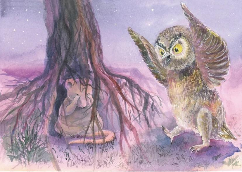 И тут Бэтти услышала странный звук, словно кто-то плачет внизу на поляне. Полетев на звук, Бэтти сразу увидела, в чём дело: среди корней, в ямку забился мышонок, а над ним, громко ухая, прыгала сова и пыталась клювом достать и съесть малыша.