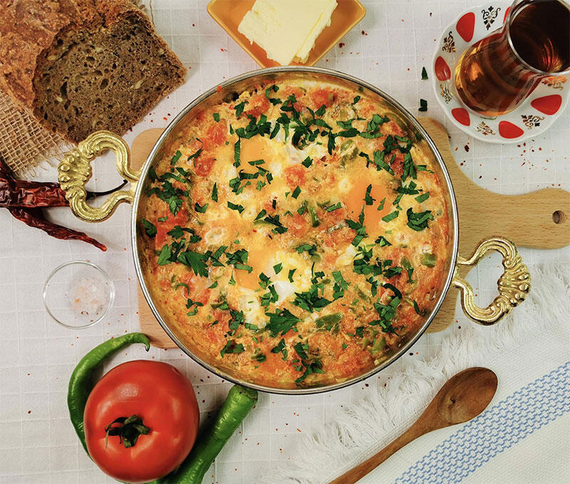 Эта яркая и сытная яичница с помидорами и перцем основа турецкого завтрака. Её аналог есть в Израиле, Азербайджане, Армении. В каждом регионе Турции менемен готовят по-разному. Интересно, что иногда её едят на обед и ужин, тогда в состав уместно добавить лук и даже чеснок. В вариант для завтрака лук и чеснок добавлять не стоит.